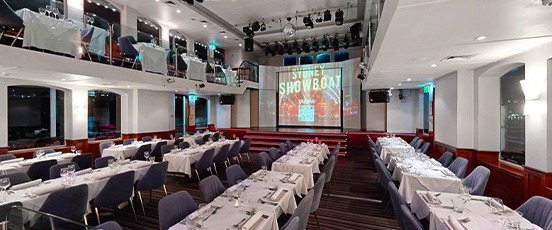 Add visuals to your event with your videos or slideshows projected onto our 65 inch screen and stage. With full visibility across two levels - the theatre layout of the Showboat makes it ideal for presentations, performances and more.